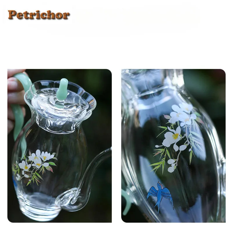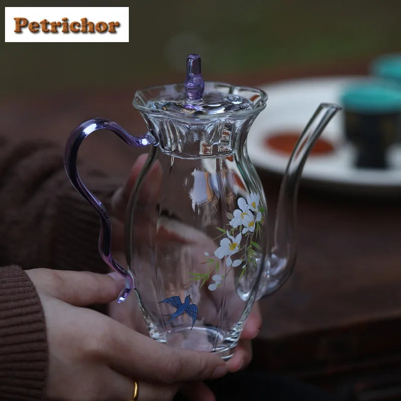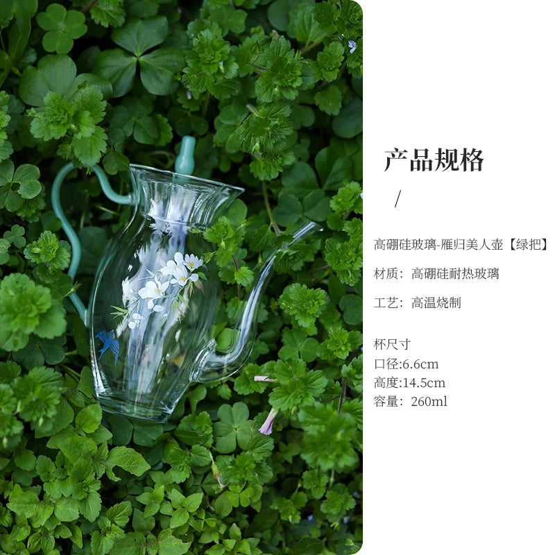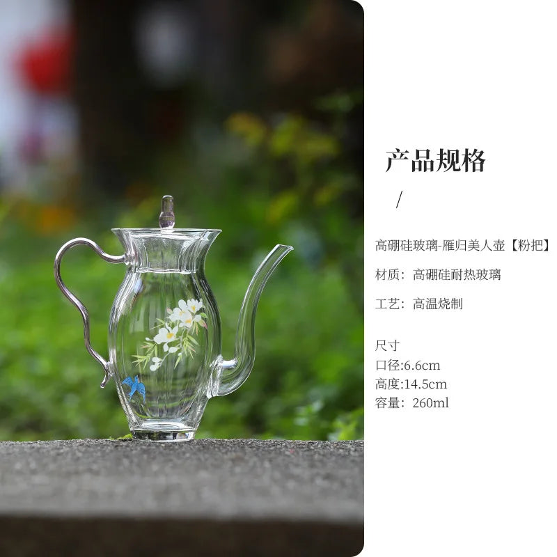 This 260ml handmade glass teapot, featuring a delicate swallow coming beauty design, is perfect for steeping green tea or any other delicate infusions. With an integrated filter, it offers both functionality and elegance for your tea ceremony or daily tea rituals.