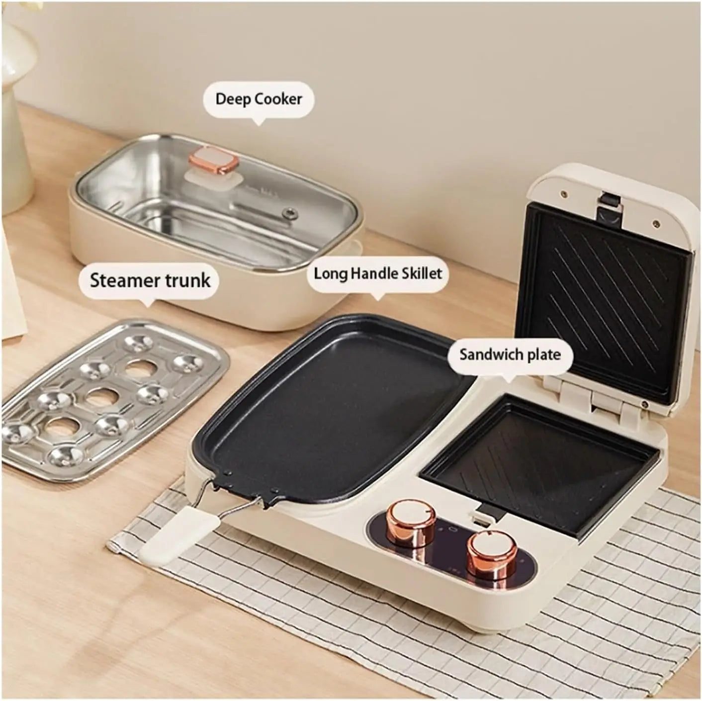 1. kitchen Gadgets 3 in 1 Breakfast Counter, Electric Mini Waffle Maker, Toast Maker, Breakfast Sandwich Maker, Home Breakfast Maker with Deep Cooker, Long Handled Skillet, Food Steamer, Sandwich Tray