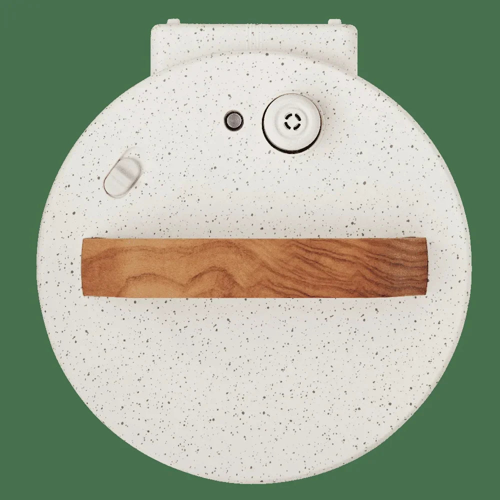 Wood grain effect on handle and panel; speckle design on housing and lid