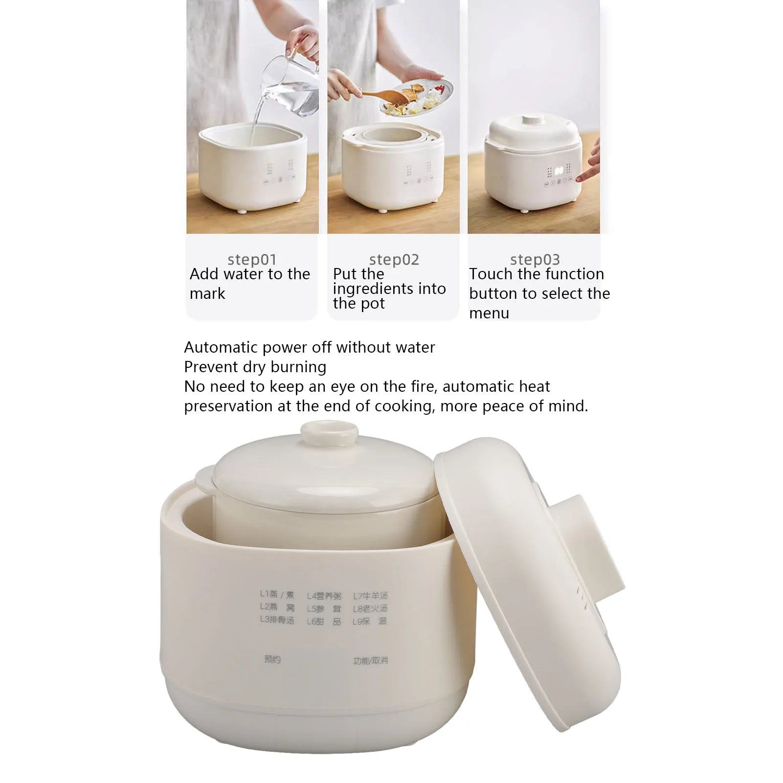 Prepare delicious soups, stews, and porridge with this 200W mini electric stew pot, featuring a 1L ceramic cooking pot, anti-dry burn function, and built-in timer for easy home cooking.