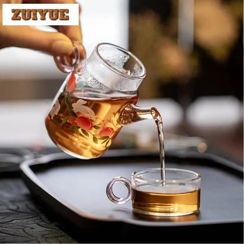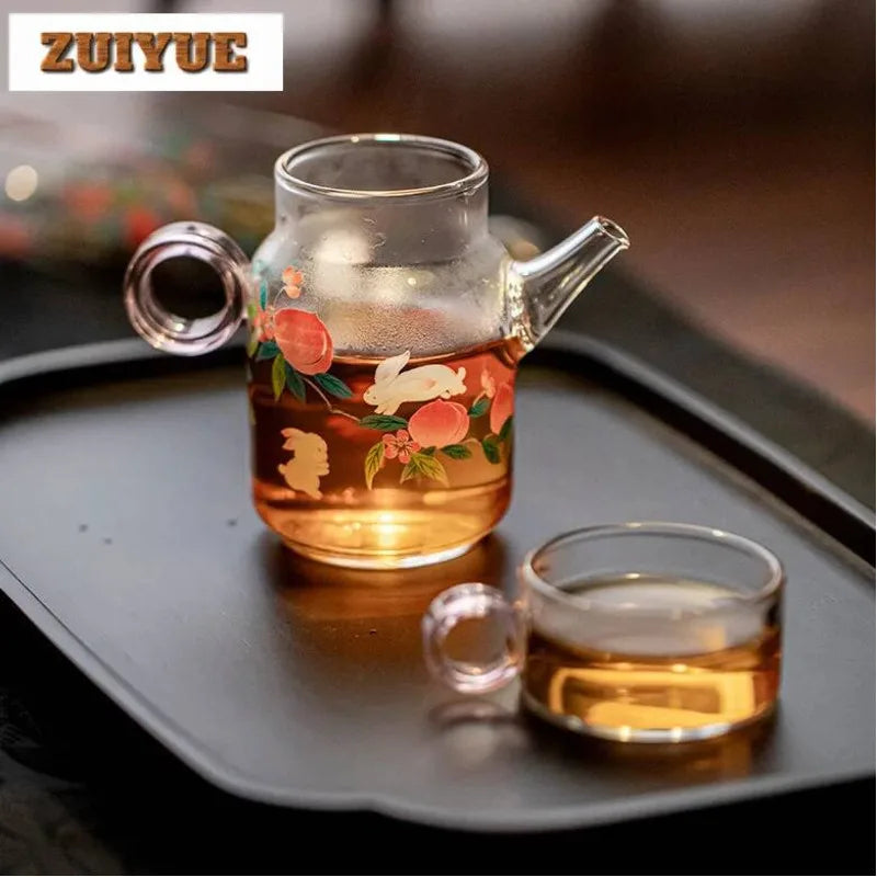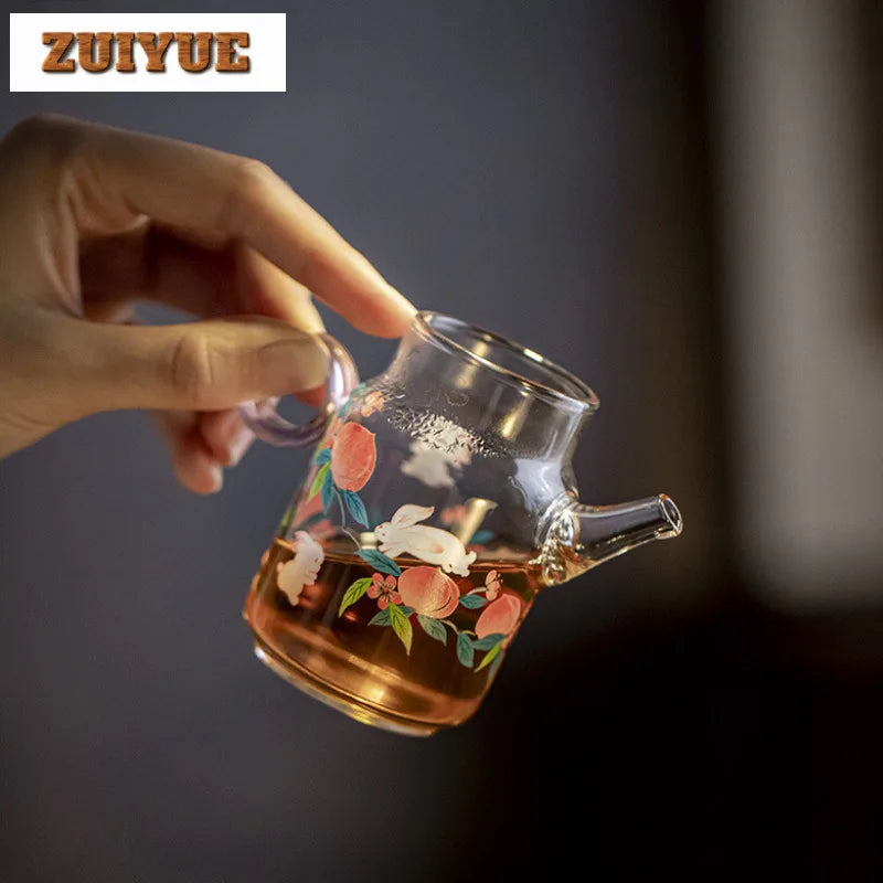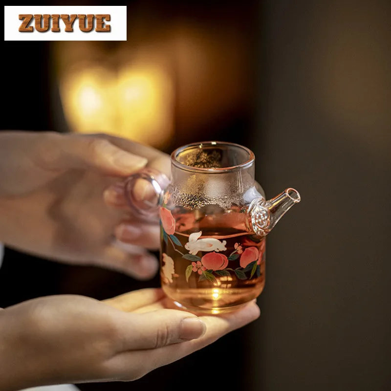 This 120ml high borosilicate glass teapot is a beautifully designed Zen-inspired tea maker. Featuring intricate rabbit longevity peach ring details, it includes a built-in strainer for a smooth tea infusion, perfect for enhancing your tea ceremony.