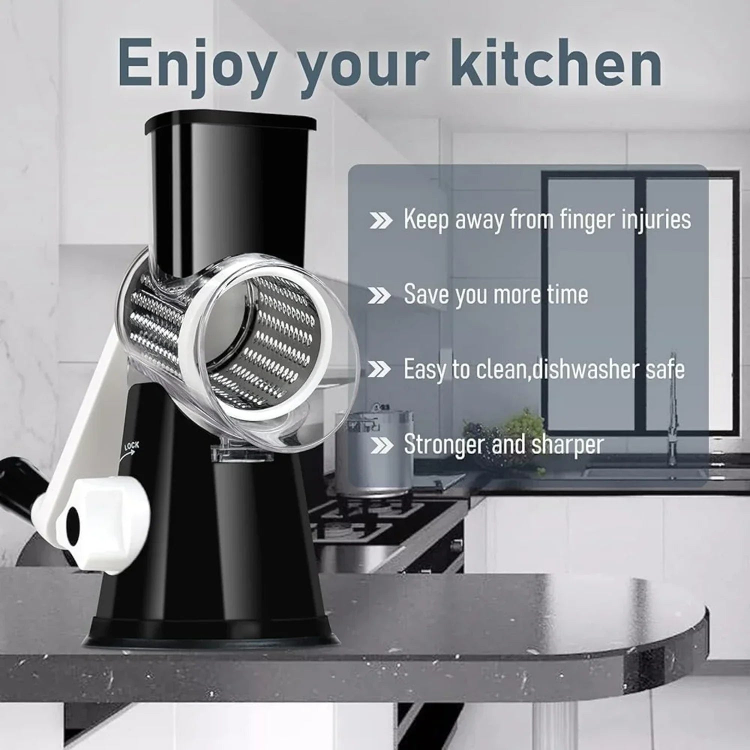 This Efficient and Versatile Dark Blue Rotary Cheese Grater features 3 interchangeable blades, making it the perfect kitchen gadget for effortless grating, shredding, and slicing of cheese, vegetables, and more.