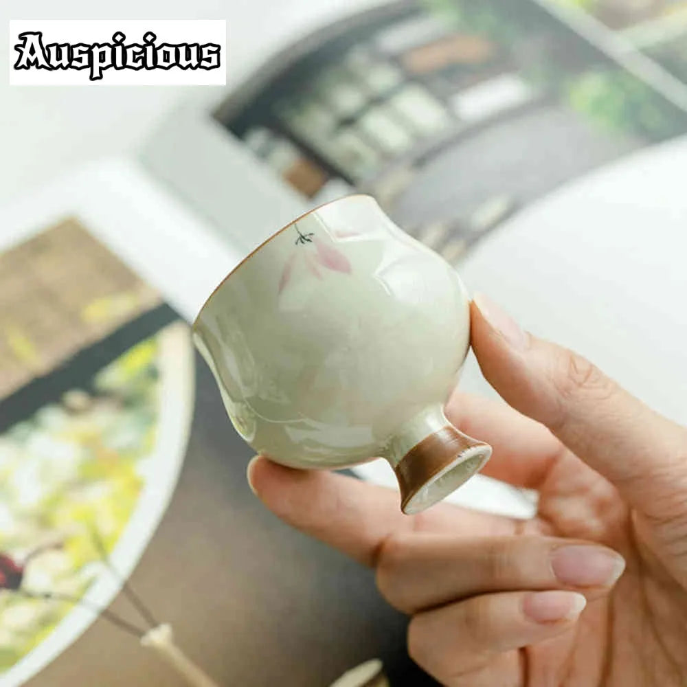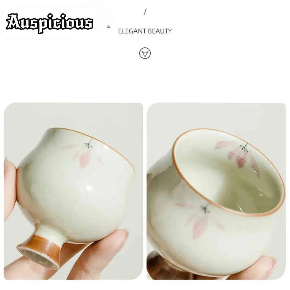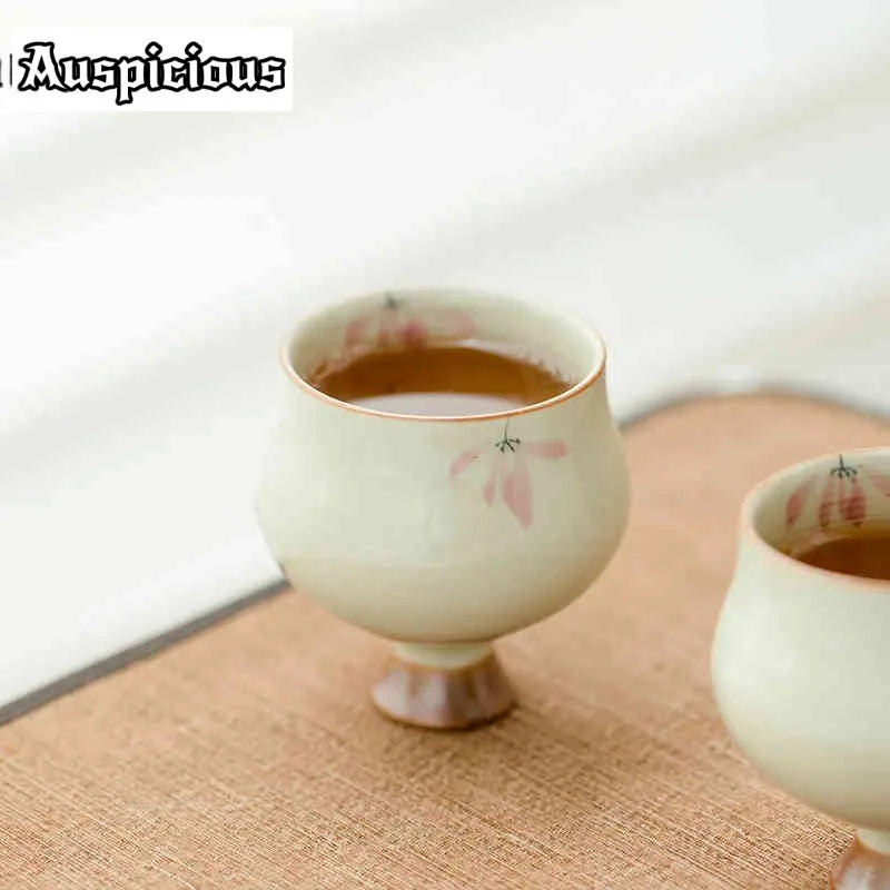 Add elegance to your tea ritual with this set of 2 retro-style teacups. Crafted from ceramic with a hand-painted pink orchid design, these high-foot cups bring a touch of sophistication to your Kung Fu tea experience.