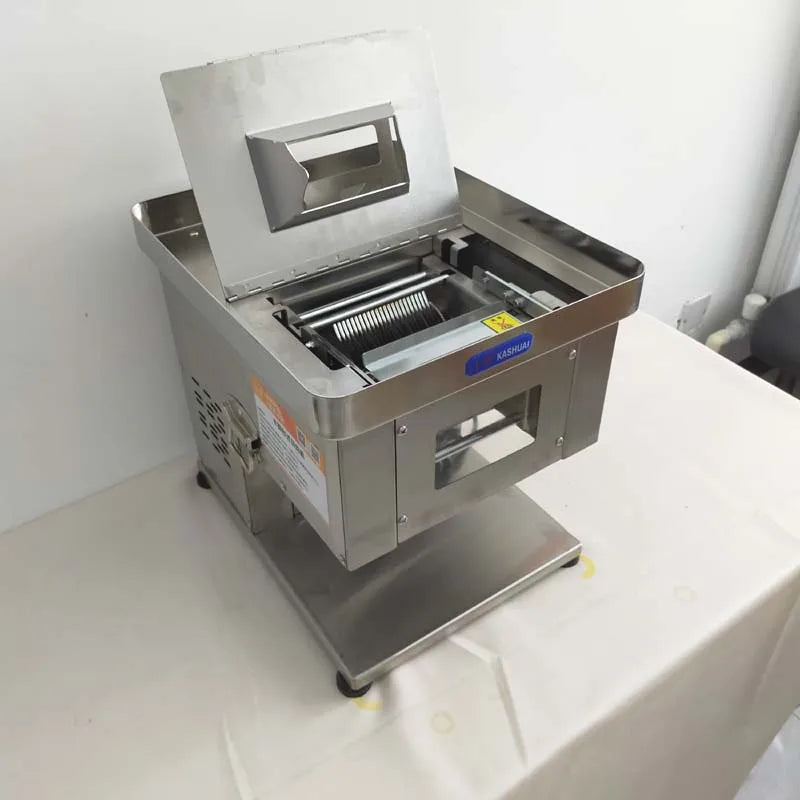 Efficiently slice and dice fresh meat with this top-quality electric meat cutter machine, designed for use in supermarkets and kitchens for fast, precise cuts.
