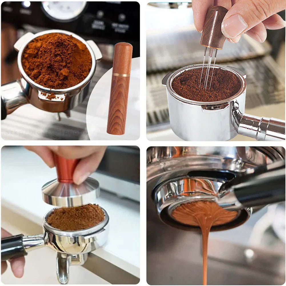 Helps improve espresso consistency by breaking up clumps and leveling the coffee bed