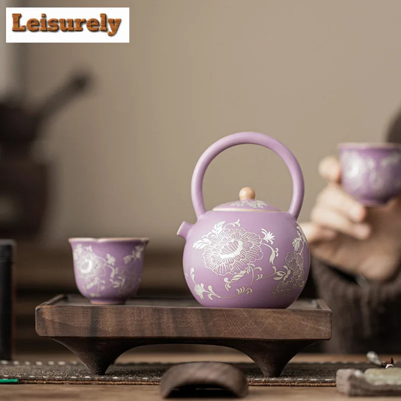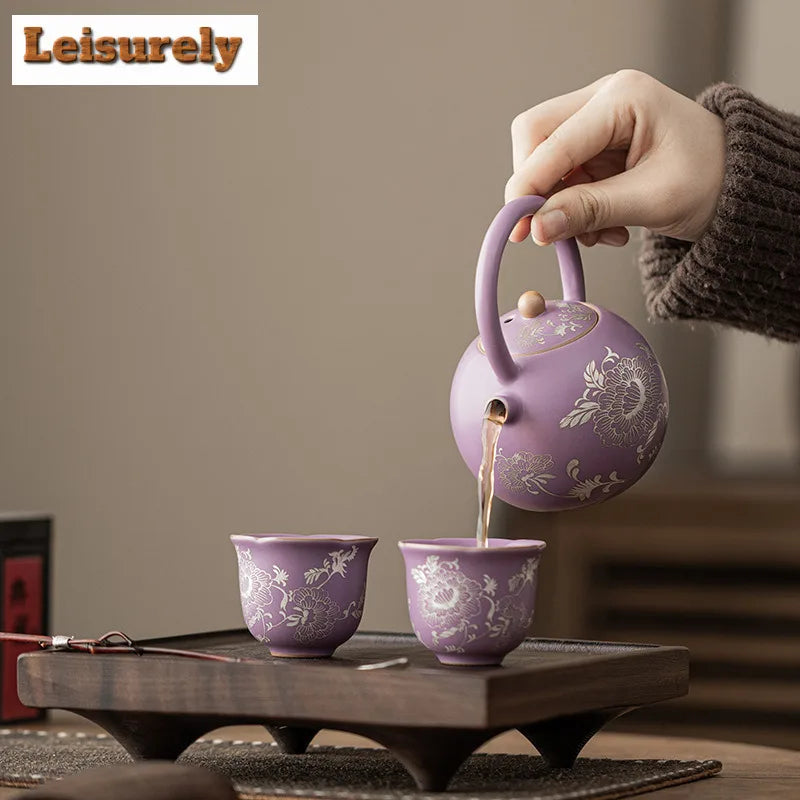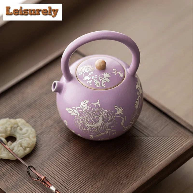 This 250ml purple Ru porcelain teapot is a beautiful blend of artistry and function. Featuring gilded silver peony designs and a lifting handle, it’s perfect for serving tea with elegance. Complete with a strainer, it ensures a smooth tea experience.