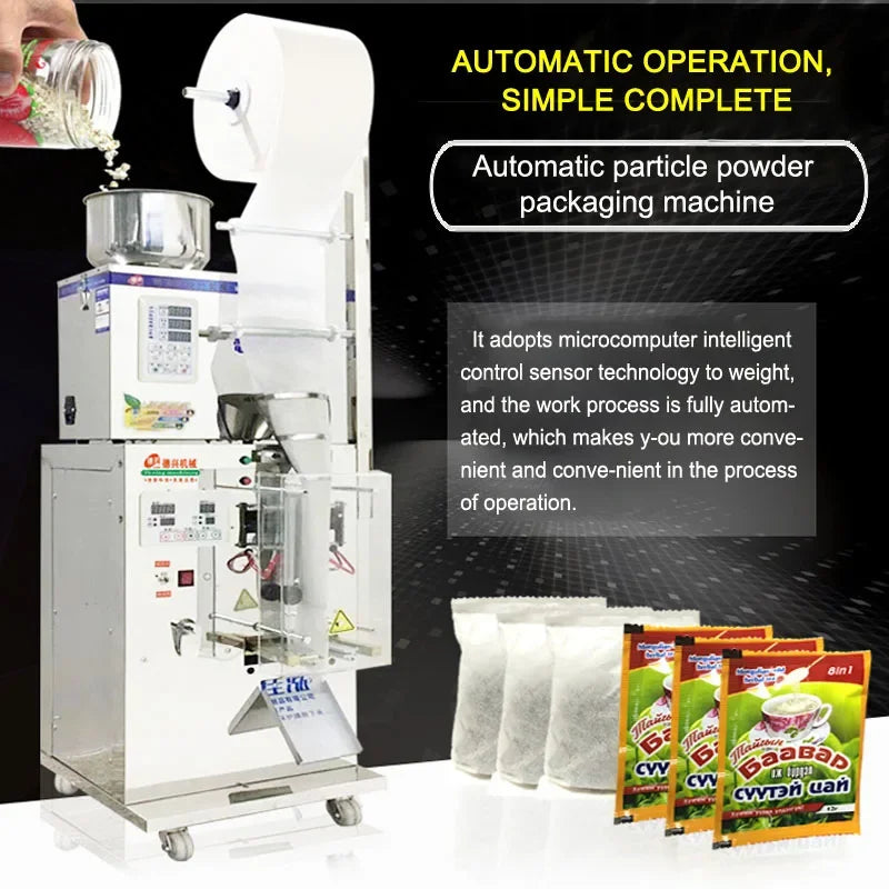 Streamline your packing process with the 1-50g Automatic Quantitative Sealing Machine — perfect for tea bag packing, powder, and granule filling with automatic weighing and sealing.