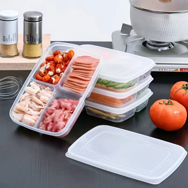 Organize and store your food efficiently with the 4-Compartment Reusable Food Storage Box — a clear plastic organizer perfect for fruits, meats, vegetables, and more.