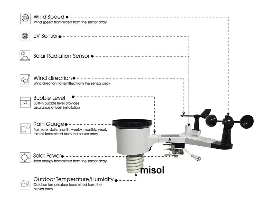 Track accurate weather data with the Misol Weather Station WH65LP — featuring an RS485 port, 10-meter 4-wire cable, and sensors for temperature, humidity, wind speed, and more.